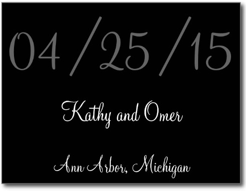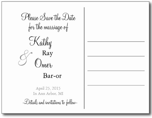 Please Save the Date for the marriage of Kathy Ray & Omer Bar-or. April 25, 2015 in Ann Arbor, MI. Details and invitations to follow.